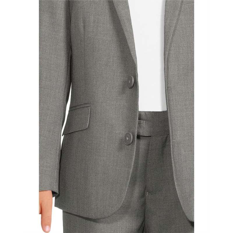 - The two-button jacket boasts a slim notched lapel, left chest besom pocket, long sleeves with a three-button closure on the cuffs, seamed front flap pockets, and a logo-printed lining.