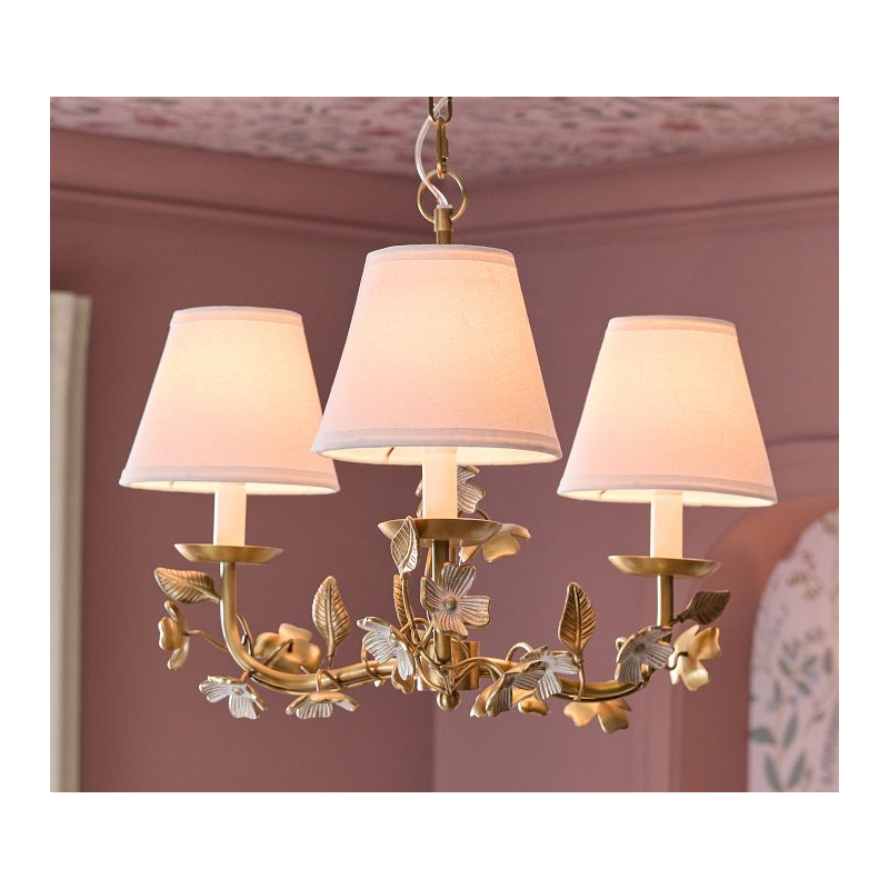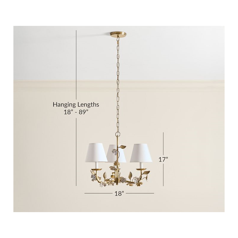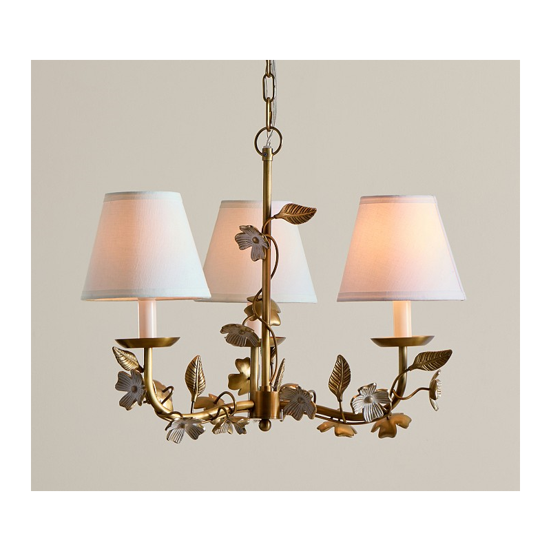 Adorned with delicate dogwood blossoms, our chandelier lends botanical beauty and warm light to their space. An antique brass finish and ivory petals give it vintage appeal, and the three fixtures are topped with classic white cotton shades.