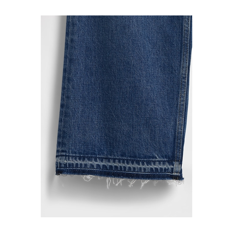 - Details: Zip fly, five-pocket, & frayed let-down hem.