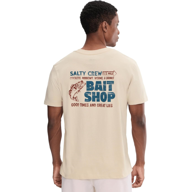 - The Salty Crew Bait Shop Short Sleeve Tee delivers everyday comfort with a laid-back coastal vibe. Made from 30 singles combed ringspun cotton, it offers a soft, lightweight feel with a smooth finish for all-day wear. Designed with a classic crew neckline, short sleeves, and a straight hem, this tee provides a relaxed, easy fit.
