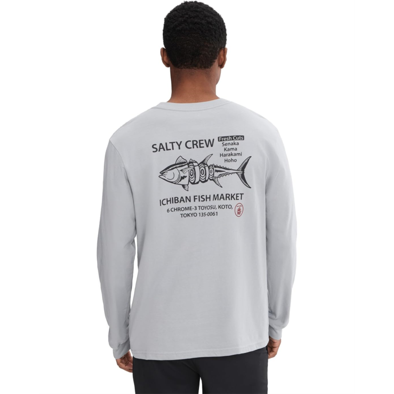 - Coastal vibes with a sharp bite in the Salty Crew Ichiban Long Sleeve. Designed in a regular fit, this crew neck essential delivers that effortlessly relaxed silhouette you can rock from sunrise surf checks to late-night hangs. Crafted from 30 Singles combed ringspun fabric, it feels incredibly soft, lightweight, and breathable, perfect for all-day comfort without compromising on durability. The easy pull-on style makes it your grab-and-go favorite, while the long sleeves offer versatile coverage for breezy beach days or layered street styling. Bold screenprinted graphics on the front and back bring a statement-making attitude, showcasing authentic Salty Crew spirit with standout detail.