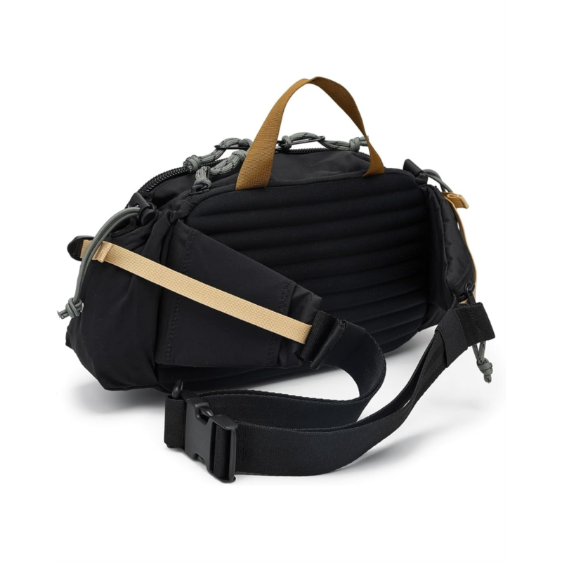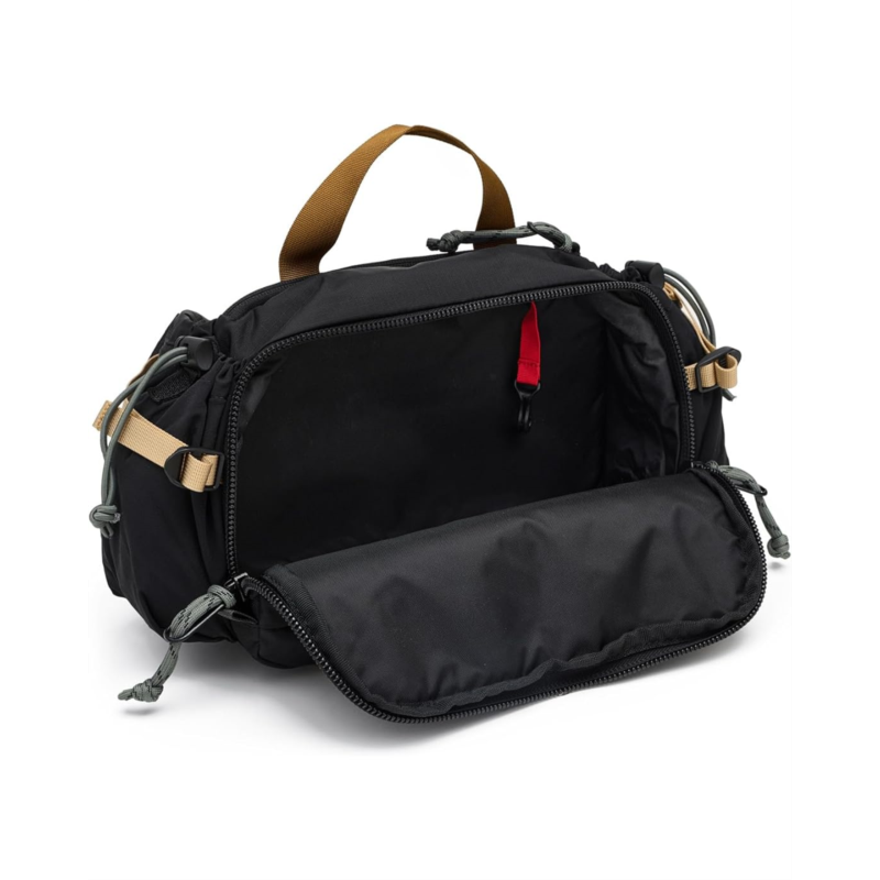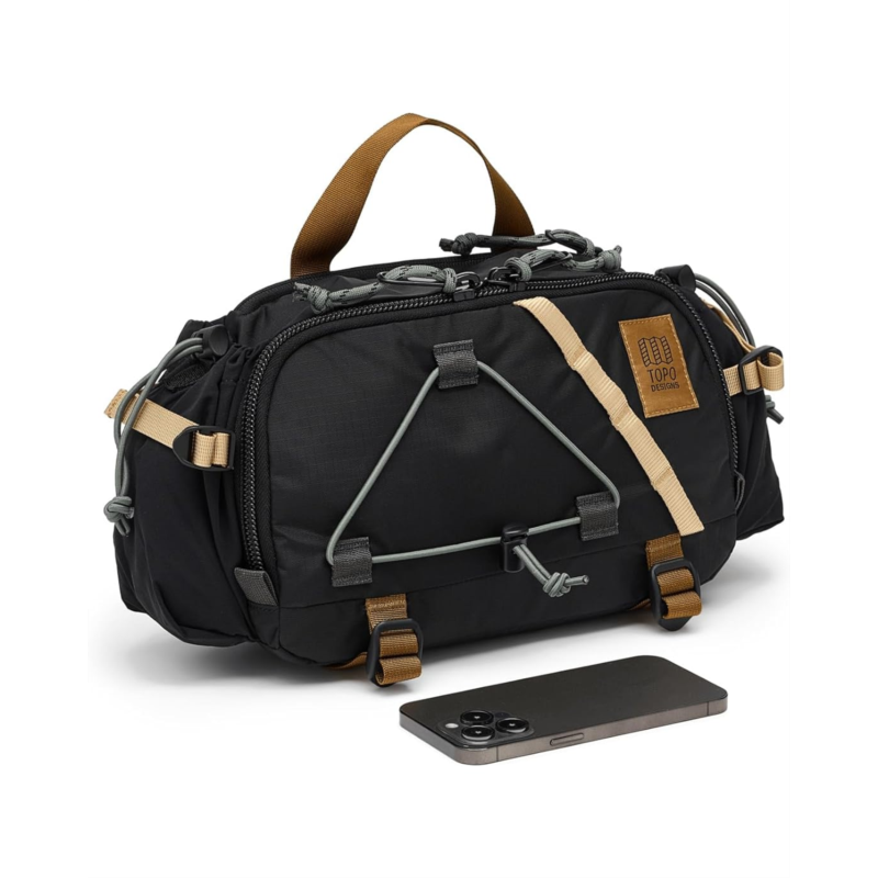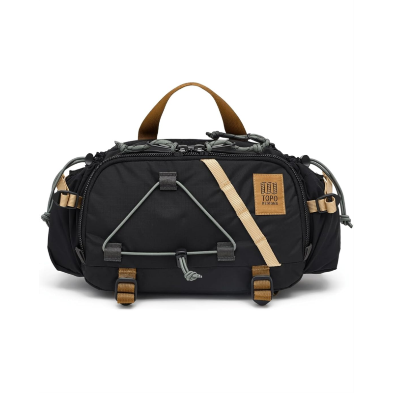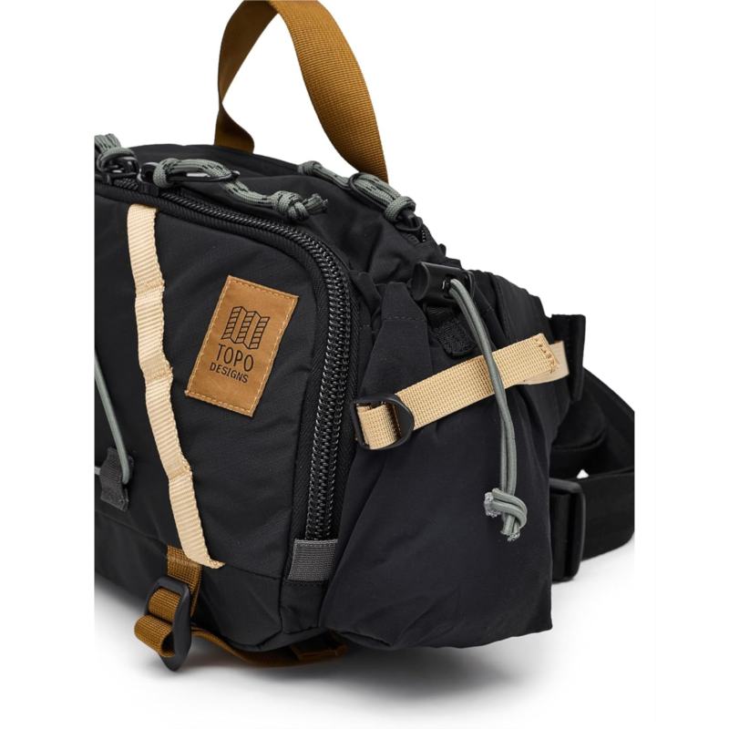 - The Topo Designs Mountain Hydro Hip Pack features a spacious zippered main compartment, a zippered accessory pocket, and two stretch water bottle pockets. Additional details include a bungee pass-through with cord lock, adjustable gear straps, front daisy chain, zippered side pocket, and a compression-molded back panel for comfort. The adjustable belt with side cinch ensures a secure fit, while multiple attachment points make it versatile for carrying extra gear.