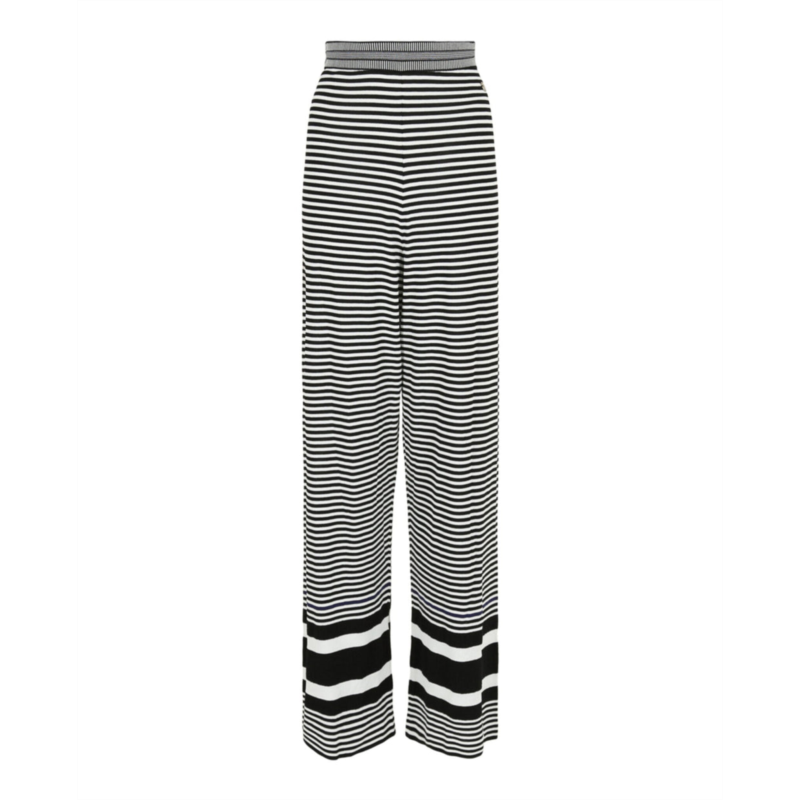 Knit pants by Ferragamo embody effortless elegance with a high-rise silhouette and relaxed fit. Unique horizontal stripes transition into a wider pattern at the hem, enhancing the aesthetic. An elasticized waistband ensures comfort while maintaining style. Made in Italy with premium materials, these pants are versatile for any occasion. - High-rise silhouette - Relaxed fit - Horizontal stripes with wider hem pattern - Elasticized waistband - Made in Italy - Premium materials