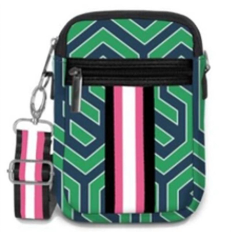 The crossbody bag is a trend that is here to stay and we especially love this style.Introducing the Carla Street Neoprene Everyday Crossbody Bag by Top It Off, a chic accessory in a Green and Navy Blue Geometric pattern. Crafted from 80% EVA and 20% Polyester Neoprene, this versatile bag features a zipper top closure, making it perfect for everyday use or travel. It includes a front zip pocket and a detachable, adjustable strap that ranges from 25'' to 47'' in length, for customizable comfort. Dimensions - 5'' width, 7'' height, and 1'' depth, with a 1.5'' wide strap.