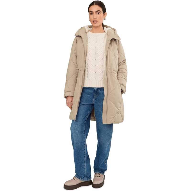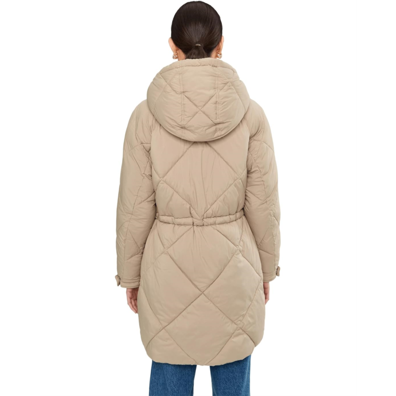 - Stylish Feature: Long diamond quilted parka jacket with a soft sherpa lined hood.