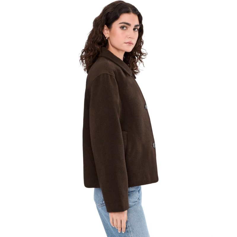 - Introducing the Levis Wool Shortie Jacket, a chic and versatile addition to your wardrobe. Crafted from luxurious faux wool, this jacket features a sophisticated buttoned front closure and two lower welt pockets for warmth and essentials, offering both style and functionality in a compact silhouette. The luxurious fabric of the jacket ensures both warmth and style for chilly days, while its short jacket design adds a trendy and modern touch to any outfit. It is styled with long sleeves, a collared neckline, and a straight hem. This button-down jacket effortlessly transitions from day to night, perfect for various occasions and settings.