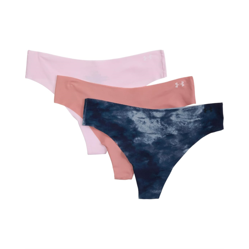 - Feel comfortable inside out by wearing the Under Armour Seamless Thong - 3 PK Printed bottoms. The pull-on style no-show thong has a 4-way stretch for a flexible fit, laser-cut edges with hem-free construction, no-dig fit silhouette, and soft gusset with tagless interior.