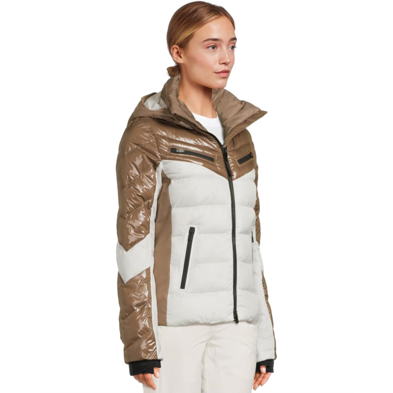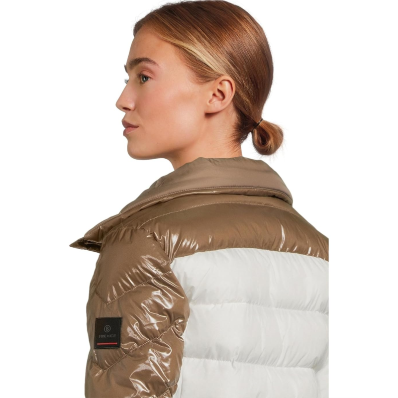 - The Bogner Fire + Ice Farina3 jacket features a slightly tailored fit and a mix of water-repellent shiny and matte fabrics. It includes a detachable hood with snap buttons, a two-way front zip with signature ''B'' logo pendants, and multiple zippered pockets?including slanted chest pockets, hand pockets, a sleeve pocket with FIRE+ICE patch, and a zippered pocket at the back. Stretchy side inserts and elasticated sleeve cuffs with thumbholes enhance mobility and warmth, while the snow guard with snap buttons and interior zippered pocket adds functional protection. Insulated with a combination of down and recycled polyester, this jacket offers lightweight warmth and all-day comfort.