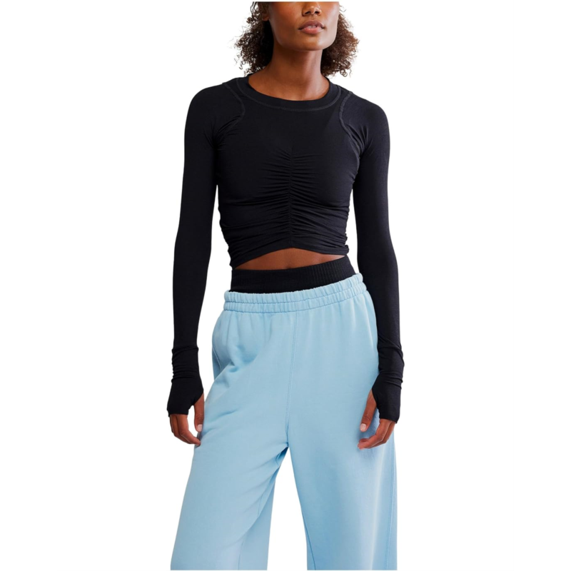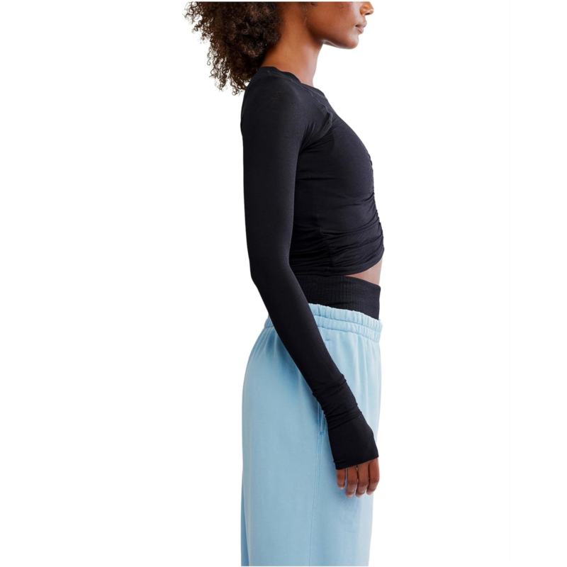 - TheFP MovementTempo Ruched Long Sleeve is a versatile activewear essential designed to move with you through every workout and beyond. Crafted from a soft, stretchy fabric, it features a ruched bust detail, crew neckline, and long sleeves with thumbholes for added coverage and comfort. The curved hem flatters the silhouette, while SPF 30 UV protection makes it ideal for outdoor sessions.