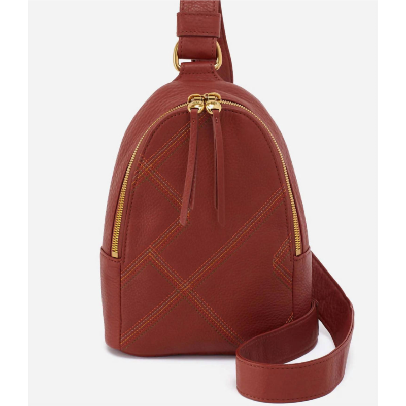 A casual and cute take on everyones favorite crossbody bag.The Fern Sling is a versatile crossbody bag made from pebbled leather, with dimensions of 6 W x 8.5 H x 2 D. It features a zip closure, a signature phone pocket on the exterior back, and an interior back zip pocket along with a slip pocket. The solid leather strap adjusts from 13.5 to 21 for a customizable fit and clips to a slider for wearing on either side. The bag is accented with Old English brass hardware and has a sandlewood lining. Model height is 511.