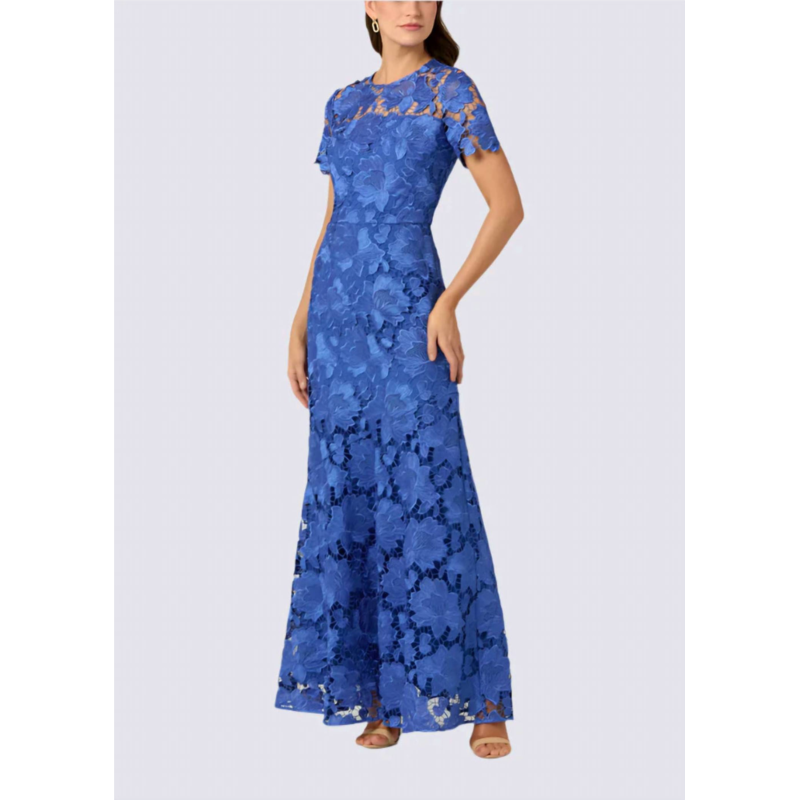 Style this maxi with your favorite statement necklace and sandals for the perfect look.Beautiful, sapphire blue lace dress. Style features a round neckline and fitted short sleeves with scalloped edges. Form-fitted silhouette with bottom skirt flare. The top yoke and sleeves are unlined, bodice and skirt are lined. Hidden back zipper. 100% Polyester. Dry clean only.