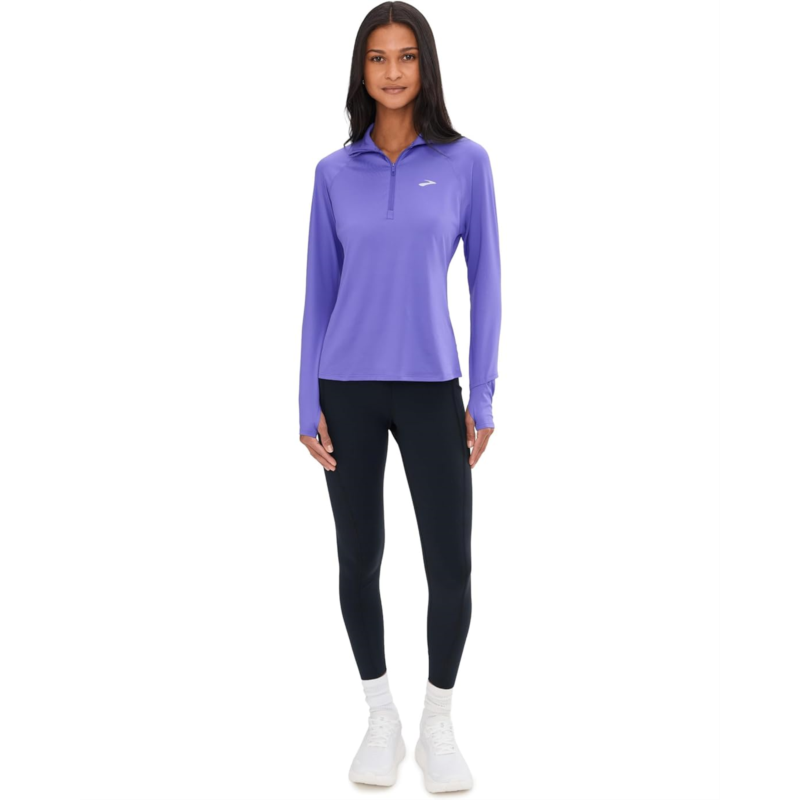 - Engineered for the modern runner, the Brooks Dash 1/2 Zip 3.0 is your go-to layering essential, delivering distraction-free comfort with lightweight warmth and next-level mobility. Crafted in a semi-fitted silhouette for a streamlined look, its built with advanced stretch fabric that adapts to your every move-whether youre pacing through early morning miles or cooling down post-run. The collared neck with a half-zipper design offers adjustable ventilation, while thumbholes keep sleeves securely in place for a stay-put feel. Reflective branding enhances visibility in low-light conditions, ensuring youre seen and safe. The pull-on design and smooth construction eliminate bulk and chafing, making it ideal for layering without compromising breathability or performance.