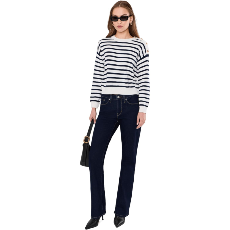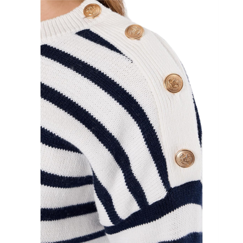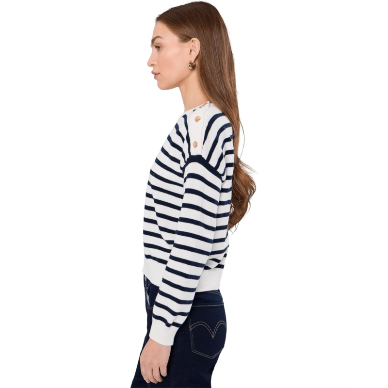 - The Vince Camuto Long Sleeve Stripe Pullover features a refined button-closure detail at the shoulder, adding a stylish accent to its classic striped design. It is designed with a crew neckline, long sleeves, and a relaxed silhouette.