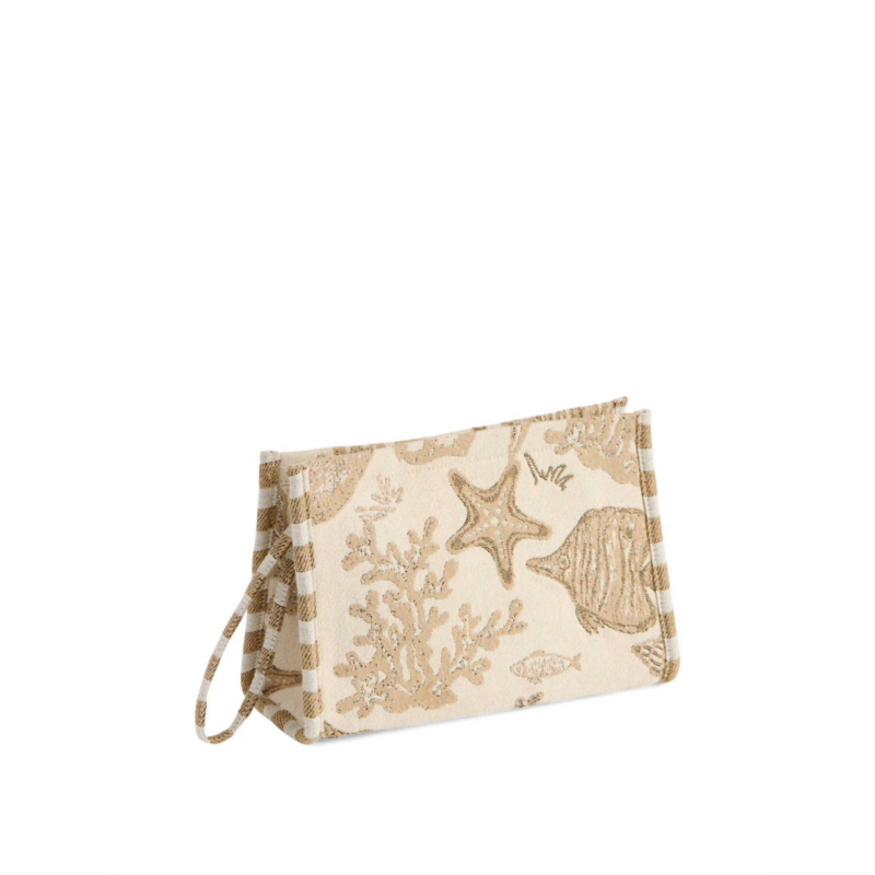Dont be mistaken by its size, this little bag holds more than youd expect!Set sail in style with the Coastal Jacquard Wristlet Pouch. Featuring a serene neutral palette with shimmering sea life patterns, this zip-top pouch brings a splash of seaside charm to your everyday look. The convenient wristlet strap makes it easy to carry whether youre strolling the boardwalk or heading to brunch.