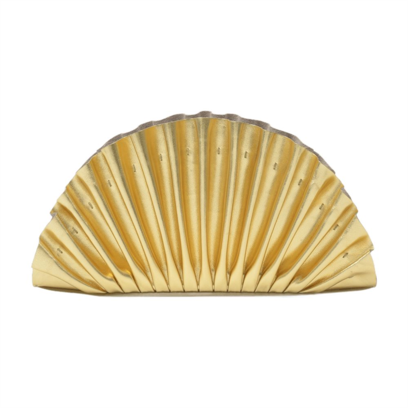 The Nala Mini Clutch by Cult Gaia exudes couture elegance, expertly crafted from smooth gold-tone calfskin leather. This distinguished piece features a unique fan-shaped silhouette with intricate pleated detailing, structured form, and a gently curved top edge. The stability of its flat base complements the luxurious aesthetic. Lined with a soft material, this clutch is perfect for enhancing sophisticated evening looks and pairs beautifully with tailored dresses. - Material - Gold-tone calfskin leather - Shape - Fan-shaped silhouette - Detail - Intricate pleated detailing - Base - Flat for stability - Lining - Soft material