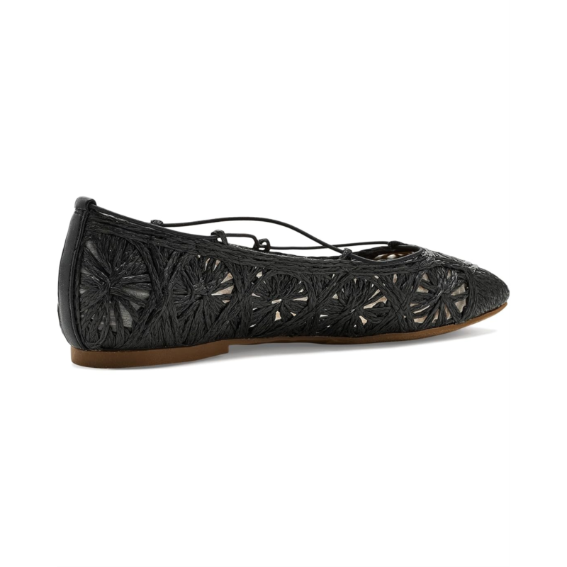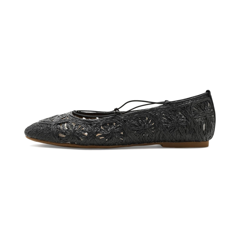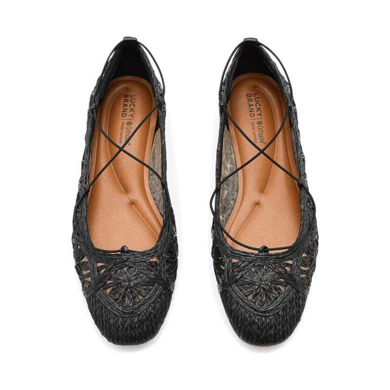 - This Lucky Brand Tennyr Crochet Ballet Flat features an intricate woven design in a natural raffia-like material, creating a breezy, bohemian look. Delicate lace-up straps add a feminine touch and secure fit, perfect for warm-weather styling. Crafted from polyester upper, lining, and cotton insole, this pair of shoes features pointed toe, low stacked heel, and brand detailing on the footbed.