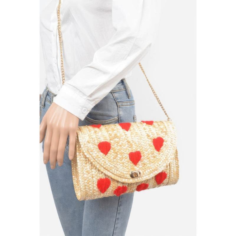 [US] FASHNZFAB heart embroidery straw clutch