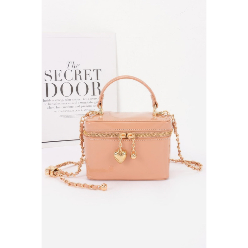 - High-shine patent faux leather with heart-shaped charm