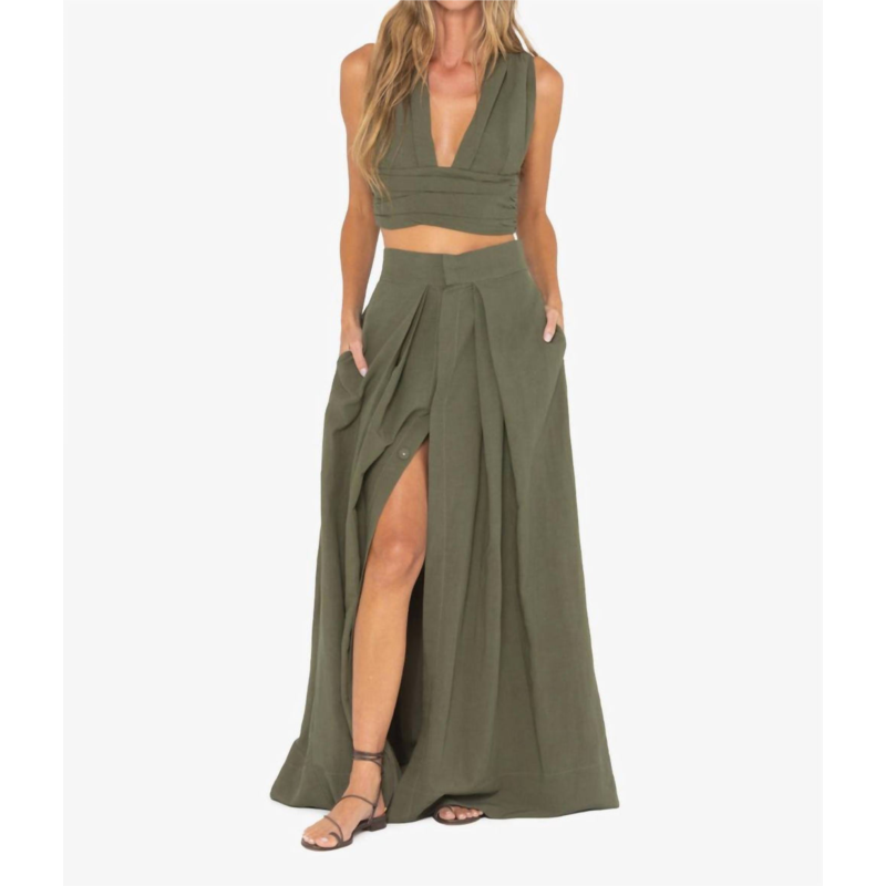Tuck in your favorite tee for a more casual yet feminine look.Experience effortless elegance with the Greer Skirt by JBQ, crafted in a solid olive hue. This maxi-length skirt features a button-up closure that allows for an adjustable slit, adding a touch of versatility to your outfit. Made from a blend of 65% Viscose and 35% Linen, it features front pleats and pockets for added sophistication and practicality. Made in the USA from imported materials, it is best cared for with a wash on a cold gentle cycle and lined dry. The model is 5''9'' and wears a size small, although the skirt runs small.
