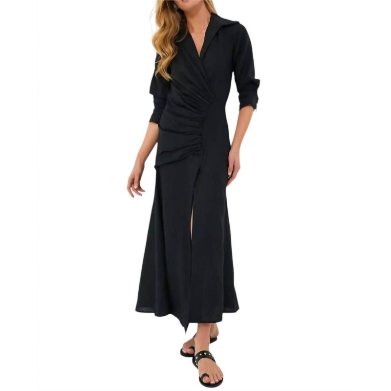Just add slides or mules and you are good to go.Discover the LYDIA DRESS by JUST BEE QUEEN, a statement piece perfect for any occasion. This asymmetrical maxi-length dress is crafted from 100% linen, ensuring a breathable and stylish fit. It features a collared V-neckline and three-quarter button-cuffed sleeves, adding sophisticated detail. Enhanced with a ruched waist and front slit, this fit-and-flare silhouette is made in the USA and is machine washable for easy care.