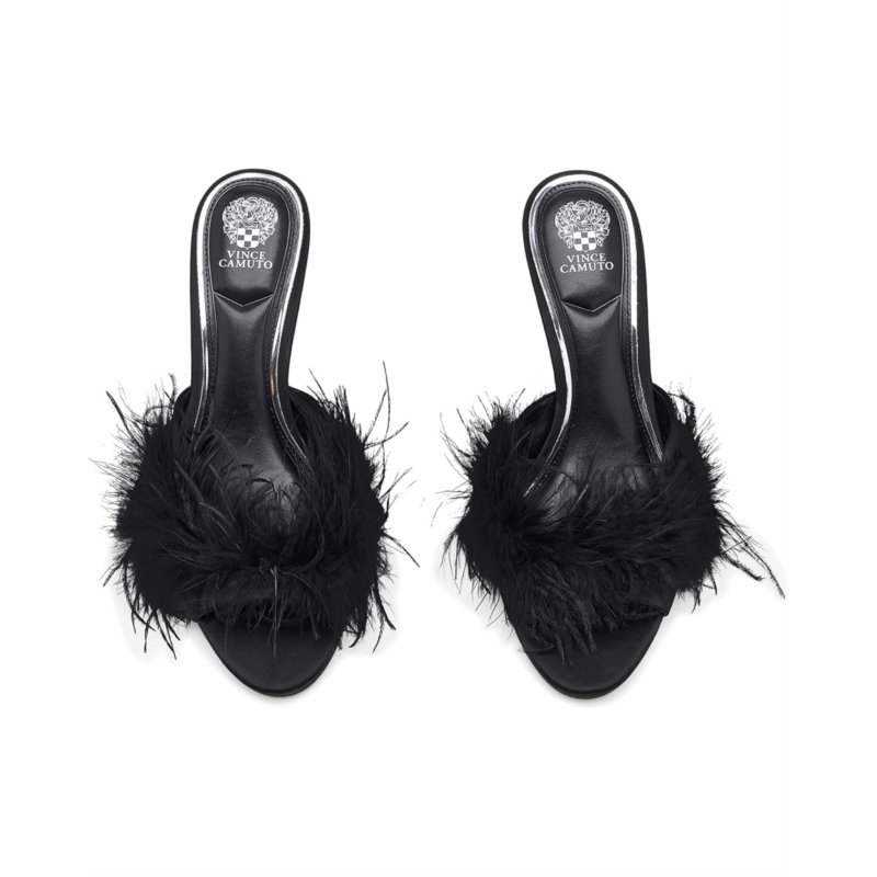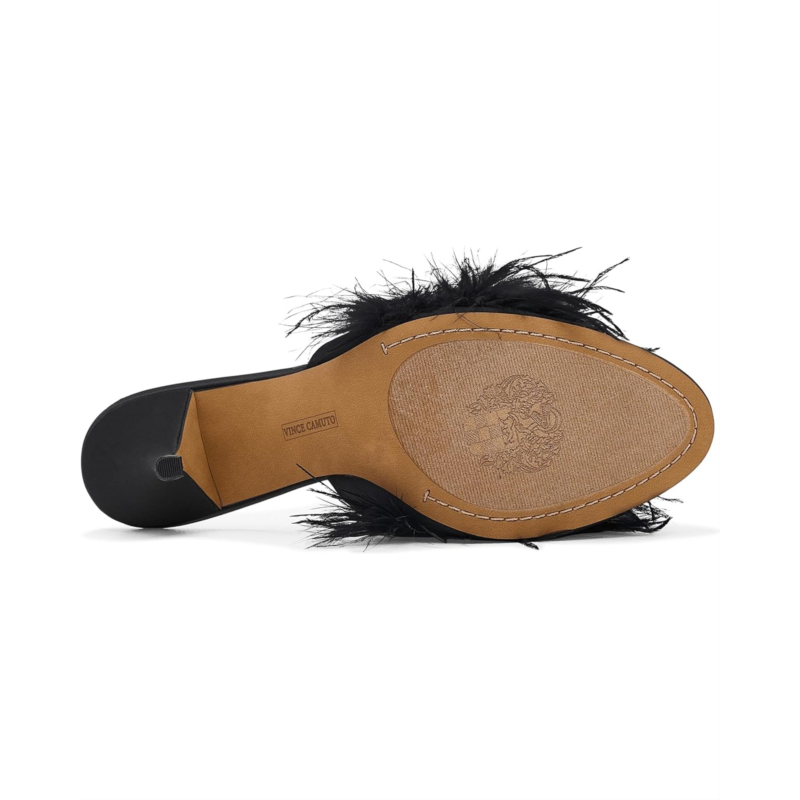 - The Vince Camuto Paelly Feather High Heel Mule Sandal brings a glamorous touch with its sleek silhouette and luxurious plume of soft feathers on the polyester upper. Effortlessly chic, this slip-on style sandal adds playful elegance to any evening look with its open almond-toe shape and stiletto heel.