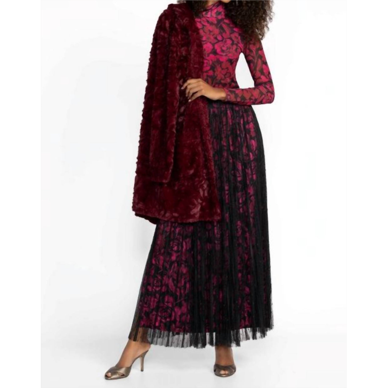 Tuck in your favorite tee for a more casual yet feminine look.The Yolanda Pleated Maxi Skirt features a vibrant floral print that creates a beautiful, flowing silhouette. It has a comfortable elastic waistband and is fully lined with bold sunburst pleating for added flair. The skirt features side slits for ease of movement. The model is 5''10 1/2'' and wearing a size S.Machine Wash.