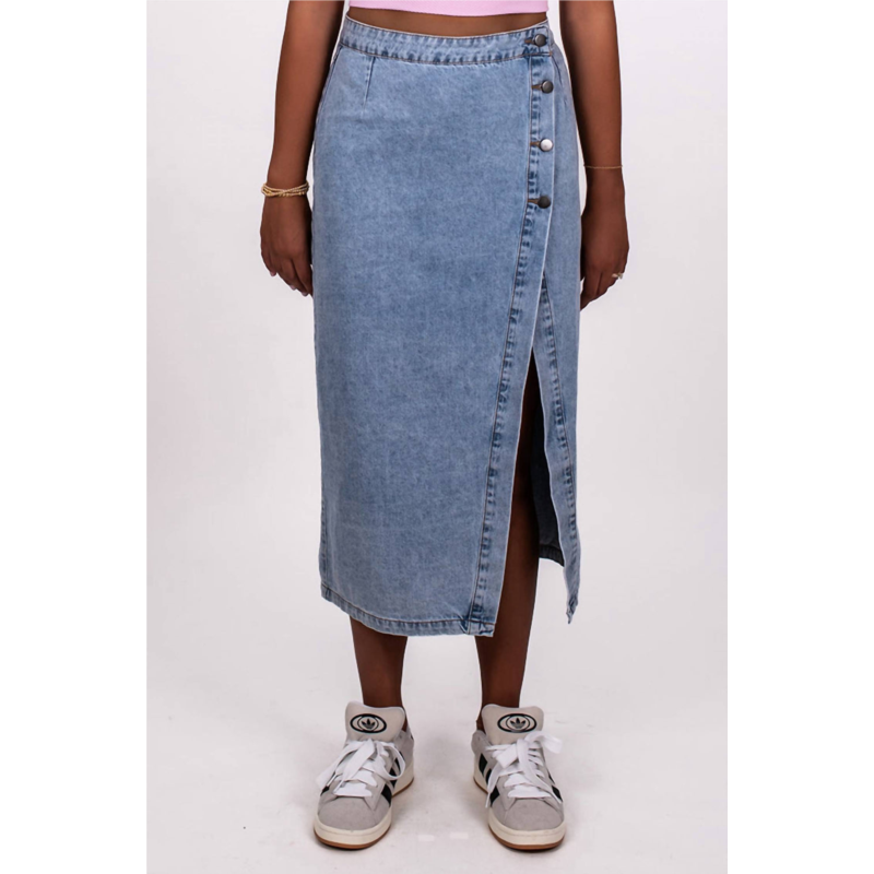 Tuck your favorite tee into this midi length skirt for an effortlessly cool look.Embrace boho chic style with the MABLE Crossover Waist Denim Midi Skirt in light blue, perfect for summer engagements. This solid pattern piece is composed of 97% Rayon and 3% Spandex, offering a comfortable and flattering fit. The skirt features a convenient button closure for easy wear. For care, hand wash cold and lay flat to dry.