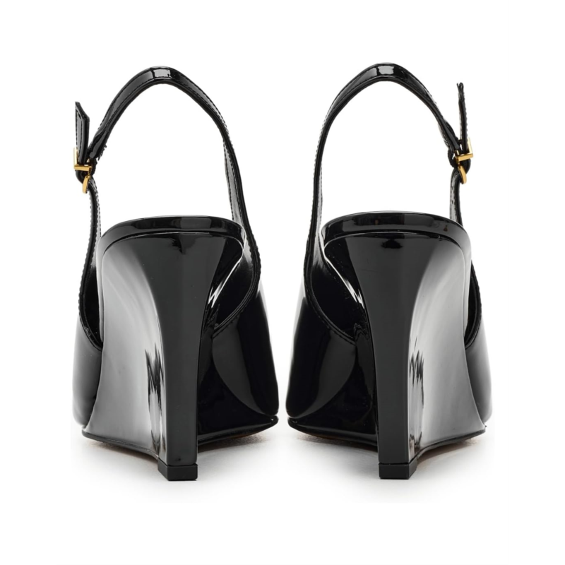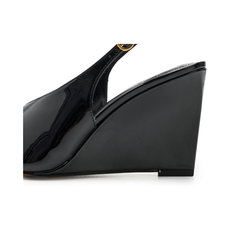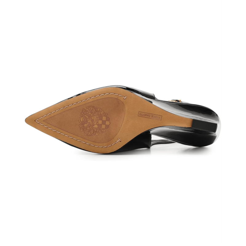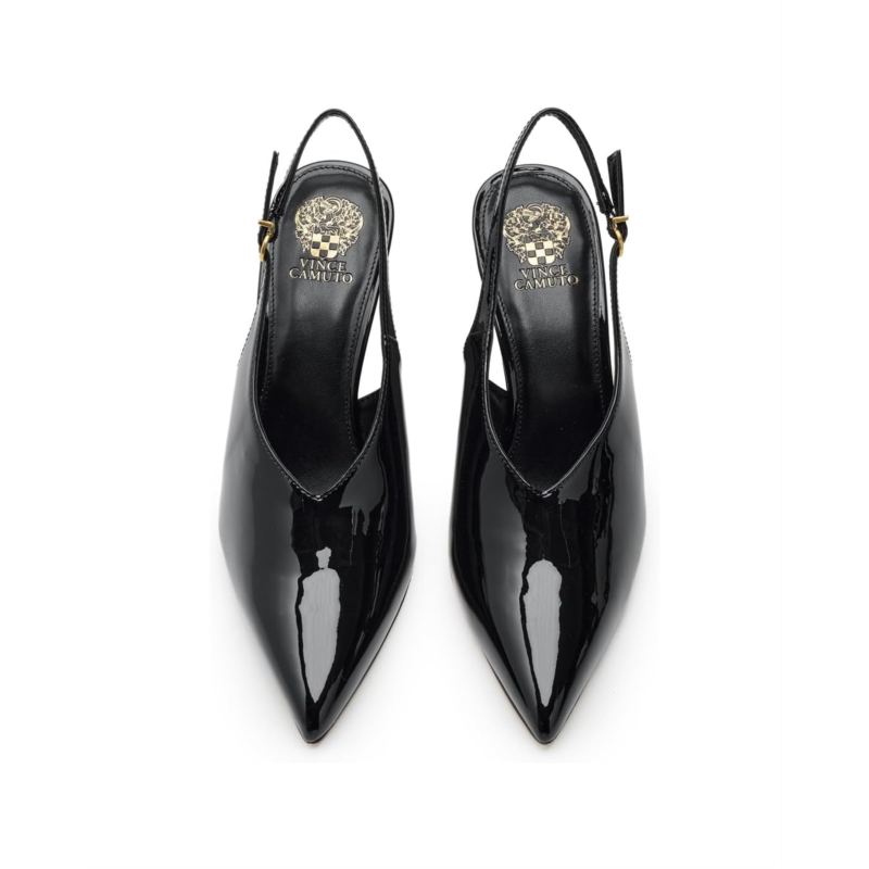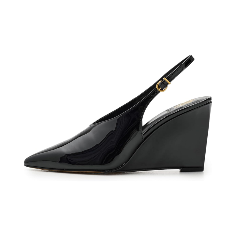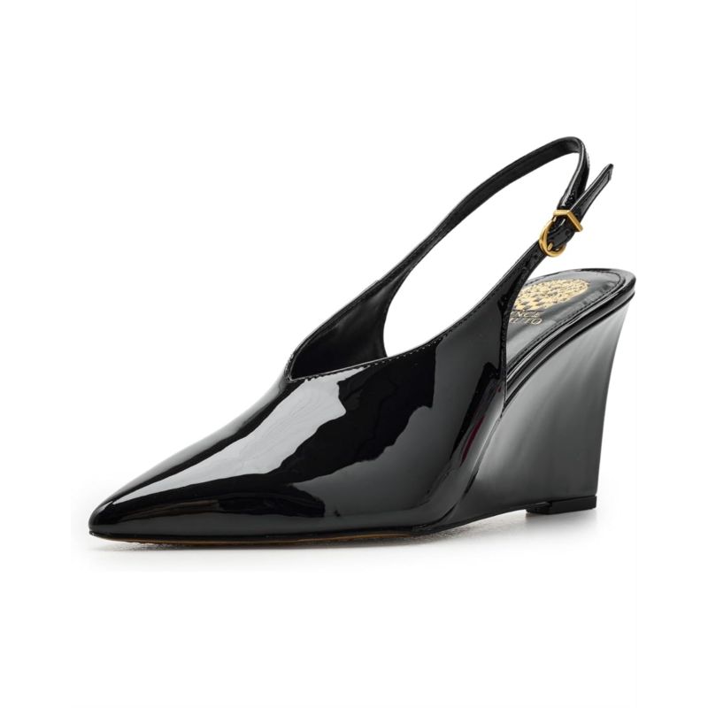- Bold glam, boss-energy heels, and polished power dressing: Vince Camuto Meristi Slingback Closed Toe Wedge. Designed to elevate your tailored looks, this striking wedge pump blends modern drama with timeless sophistication. The faux leather upper delivers a sleek, refined finish, while the sharp pointed toe adds instant edge and elongates your silhouette. An eye-catching open back keeps the look fresh and fashion-forward, perfectly balanced by a skinny slingback strap with a secure buckle closure for a customized fit. Inside, a smooth polyester lining enhances comfort, complemented by a rubber insole that cushions every step. The sturdy rubber outsole offers dependable traction, making this towering wedge heel as wearable as it is chic.