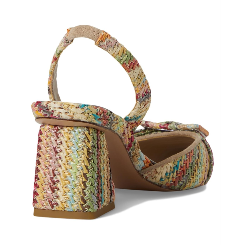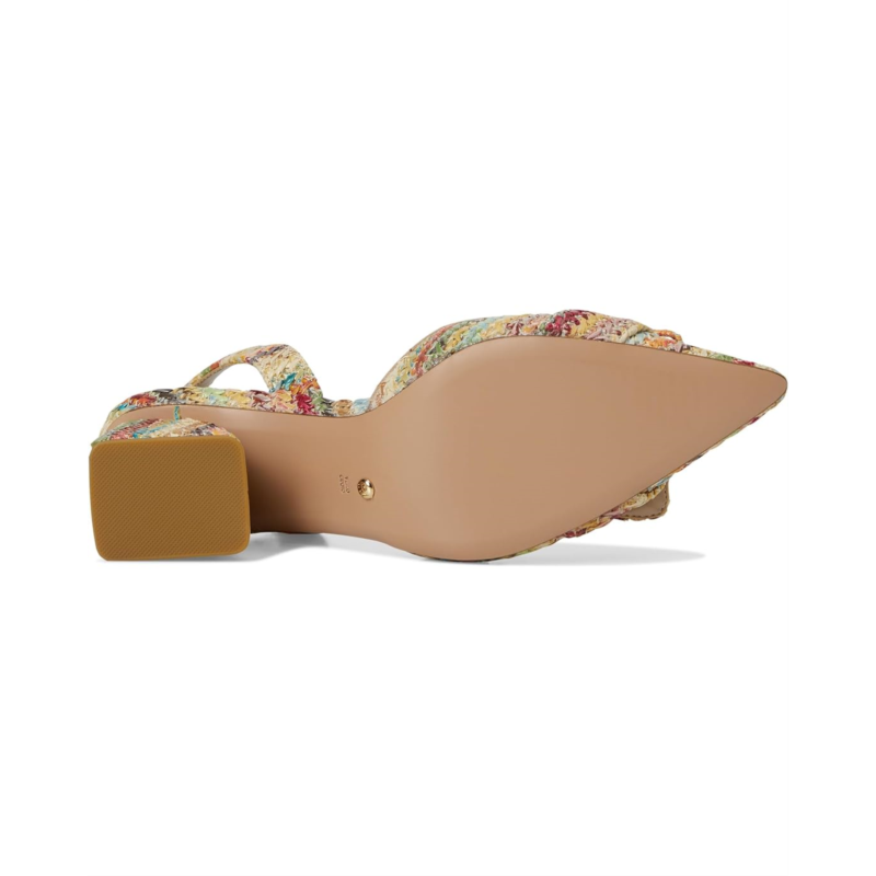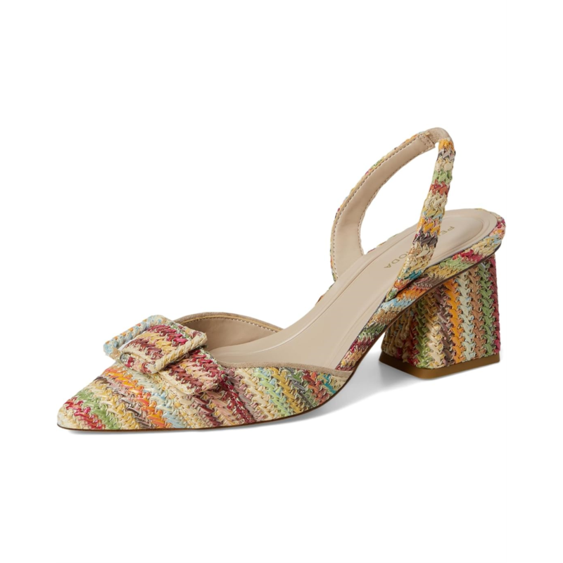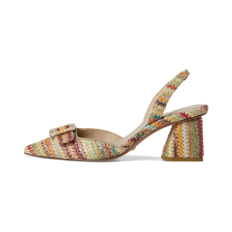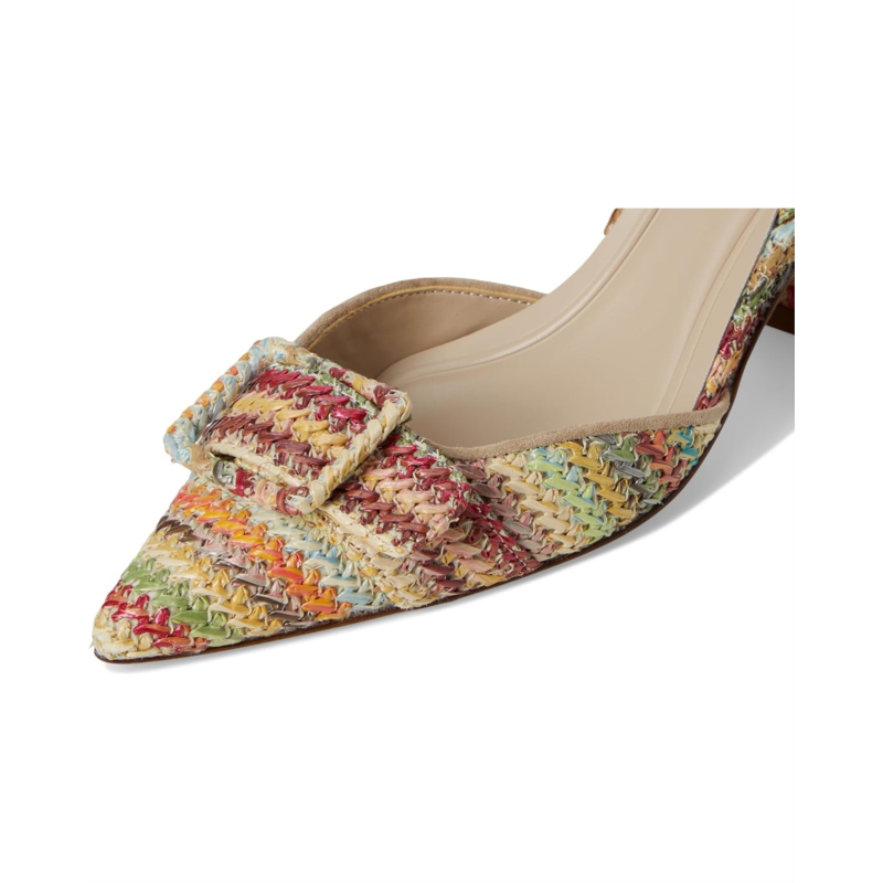 - A pointed toe pump with multi-colored woven crochet upper, the Pelle Moda Imia 3 boasts a halter sling with elastic for fit. Offering the perfect lift, the block heel has modern angles covered in raffia.