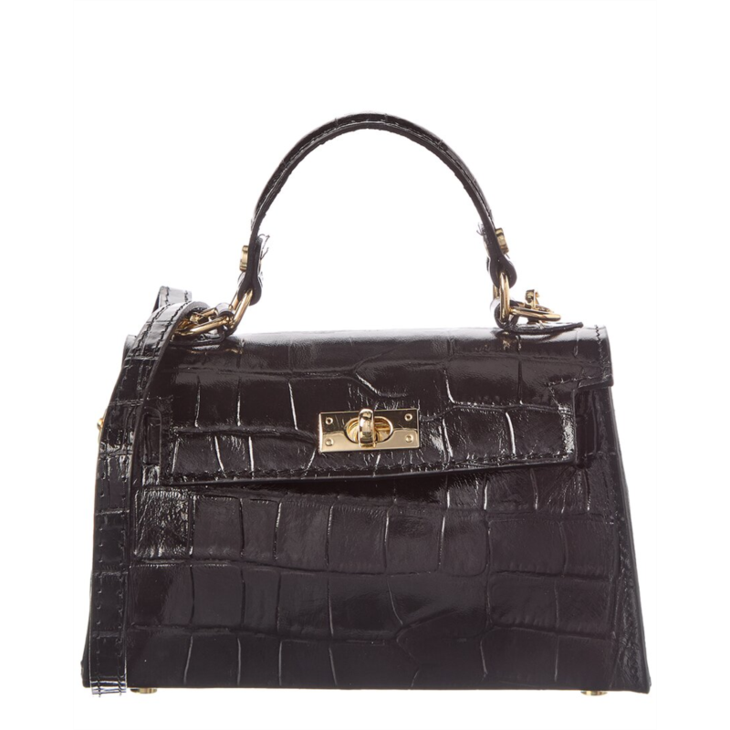 Introducing the Persaman New York Blakely Croc-Embossed Leather Satchel, a luxurious and stylish addition to any woman''s handbag collection. Made in Italy, this satchel features black croc-embossed leather with gold-tone hardware for a chic and sophisticated look. The interior design includes a zippered pocket for keeping your essentials organized, while the exterior boasts a fold-over flap with a turnlock closure for added security. The top handle has a 3.5-inch drop, and the adjustable and removable shoulder strap has a 26-inch drop for versatile carrying options. Measuring 8.5 inches wide, 5.5 inches high, and 3 inches deep, this satchel is the perfect size for everyday use. The protective feet at the bottom ensure that your bag stays in pristine condition. Please note that all measurements were taken by hand and are approximate, so slight variations may occur. Elevate your style with the Persaman New York Blakely Croc-Embossed Leather Satchel.