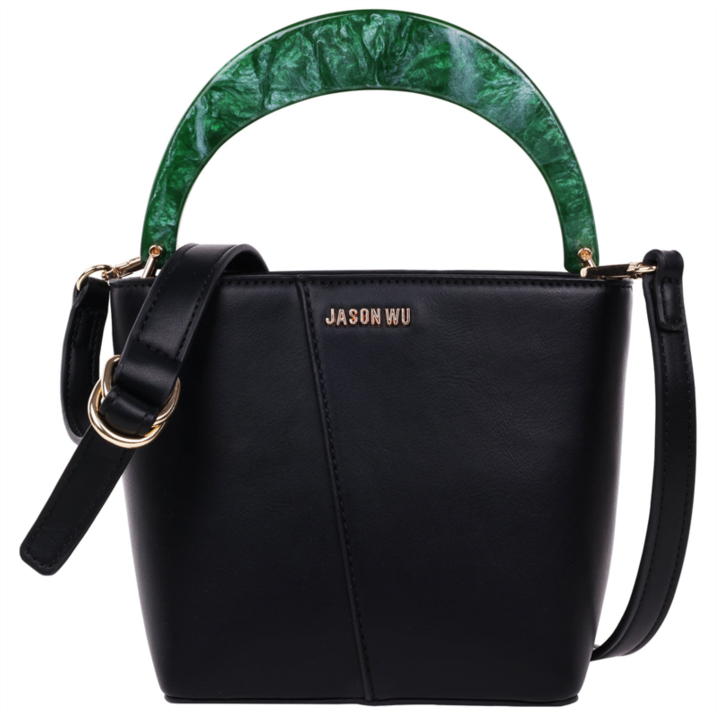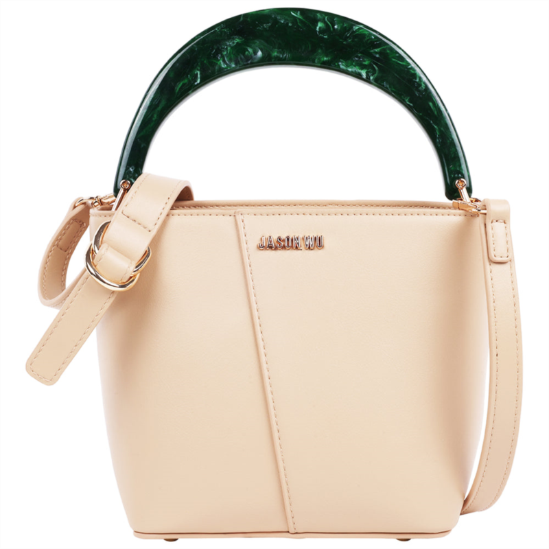 Minimalist design meets sculptural flair in this Jason Wu Small Smooth PU Tote. Featuring a rich cream-tone body and a bold green acrylic top handle, this tote is a fresh take on structured elegance. With a compact silhouette and a removable crossbody strap, it’s perfect for fans of Jason Wu’s refined yet playful aesthetic. Ideal for day-to-night looks with a modern twist-Officially licensed Jason Wu Bag-3.5'' Top handle drop-Gold hardware-Zipper closure-Interior backwall zip pocket, Frontwall slip pocket-Exterior, Sleek smooth PU construction with clean architectural lines, Glossy marbled acrylic top handle in a statement green hue, Subtle front Jason Wu logo detail in polished gold-tone finish-Material 100% polyurethane-Dimension - 6.5H X 7.75W X 3.75D-Weight 1 lbs.-Imported