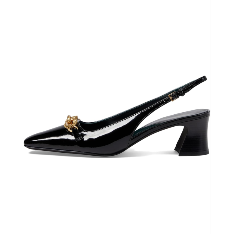 - Refine your look with the modern edge and sophistication of the Tory Burch 55 mm Jessa Slingback Heels. Sleek and incredibly chic, these shoes are beautifully ornamented with a metallic horsehead hardware. The squared toe and the sculptural block heel further add to the stylistic elements of this footwear.