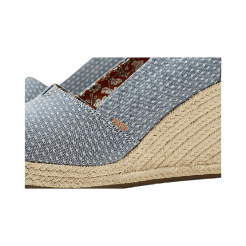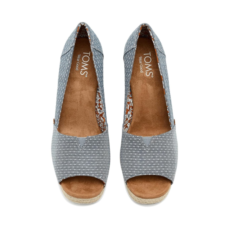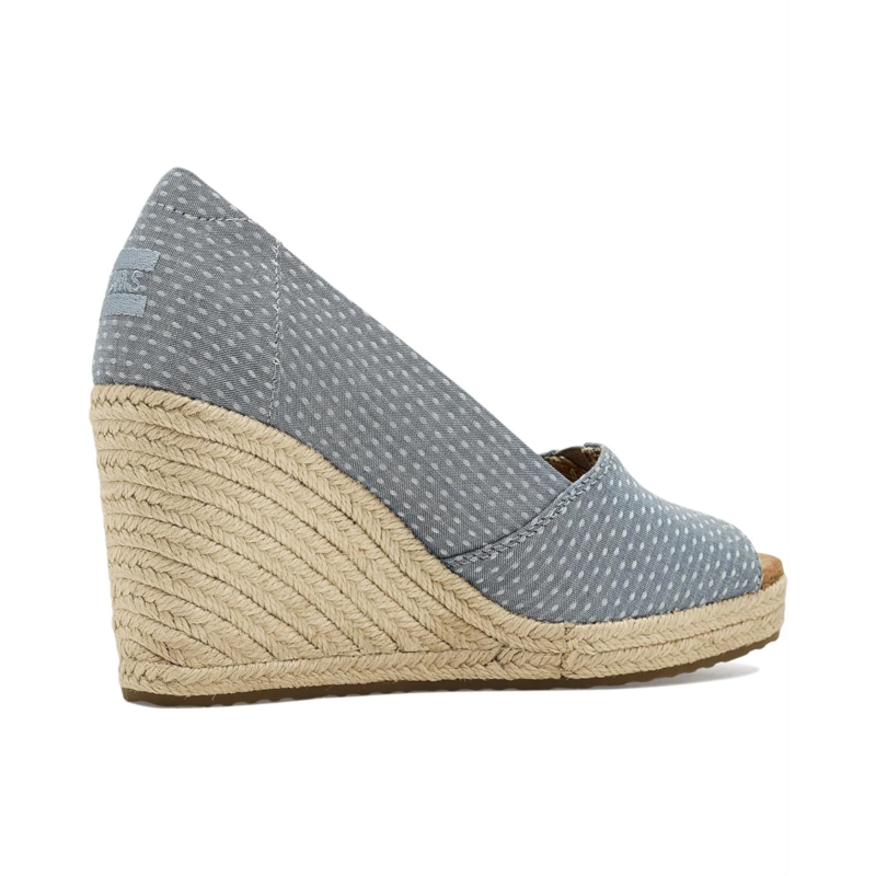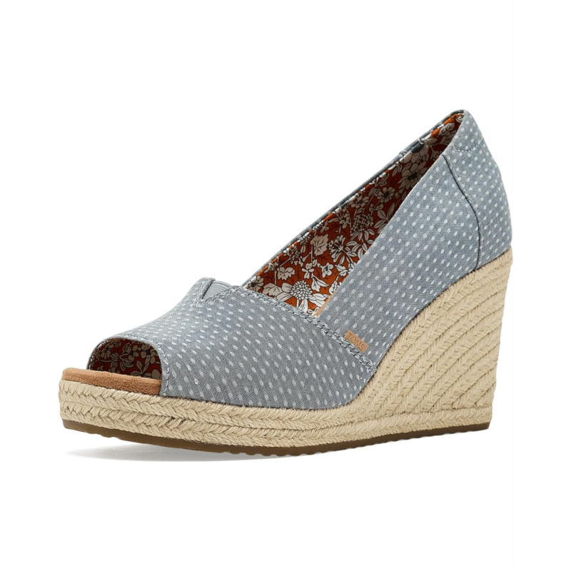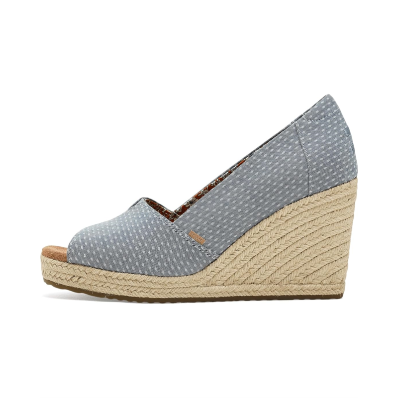 - TOMS Essential Wedge is a chic peep-toe sling wedge that brings together classic design details and modern comfort innovation. Featuring a padded heel collar and V-Gore detail for flexible movement, this wedge silhouette is elevated by a jute-wrapped midsole and delicate Moroccan crochet overlay for boho-inspired flair. The Custom CloudBound foam insoles deliver lightweight cushioning and support. Your TOMS purchase helps support childrens education, health, and well-being, giving kids everywhere the gift of better tomorrows. As a Certified B Corp, we are proud to meet their standards of transparency, accountability, and social/environmental performance.