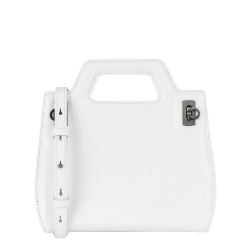 The Mini Wanda leather top-handle bag by Ferragamo showcases sophisticated craftsmanship and sleek design. Its smooth, structured silhouette features elegant cutout top handles and versatile functionality. Silver-tone hardware, including two front tuck closures, enhances its appeal. The interior includes dual card slots, catering to the modern woman on the go. An adjustable, detachable shoulder strap allows for easy transitions between hand-held and shoulder carry. Crafted from fine calfskin leather, this bag embodies timeless elegance. - Dimensions - Length - 7.56, Width - 2.56, Height - 7.31, Strap Drop Length - 22, Handle Drop Length - 2.06 - Material - 100% Calfskin Leather - Care - Specialist clean only - Origin - Made in Italy
