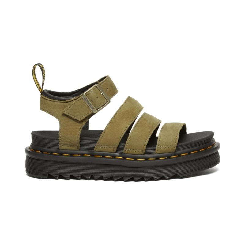 - Indulge in the Dr. Martens Blaire Sandals that effortlessly combine fashion and function. Designed with a tumbled leather upper and a chic three-strap design, these sandals add a touch of edgy sophistication to any outfit. The sandals are welted with signature yellow stitching and Goodyear welt construction.