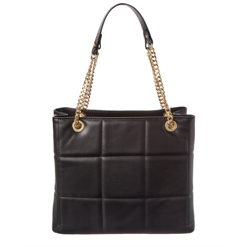 Upgrade your accessory game with the Persaman New York Briella Quilted Leather Tote. Crafted from luxurious black quilted leather and adorned with gold-tone hardware, this stylish tote is the perfect blend of classic and chic. The chain straps add a touch of elegance, while the spacious interior features a printed canvas lining, zippered pockets, and a wall pocket to keep your belongings organized. Made in Italy, this tote measures 13.5 inches wide, 11.5 inches high, and 5.5 inches deep, with a shoulder strap drop of 13 inches for added convenience. The zipper closure ensures your essentials stay secure while on the go. Please note that all measurements were taken by hand and are approximate, with slight variations that may occur. Elevate your everyday style with the Persaman New York Briella Quilted Leather Tote.