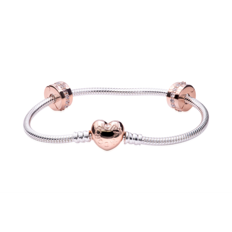 -This set includes a 14k rose gold-plated heart clasp bracelet - two 14k rose gold-plated Sparkling Row clips and a 14k rose gold-plated charm.