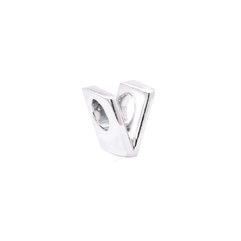 - Minimalist yet elaborate this sterling silver V charm features contrasting textures on its front and back.