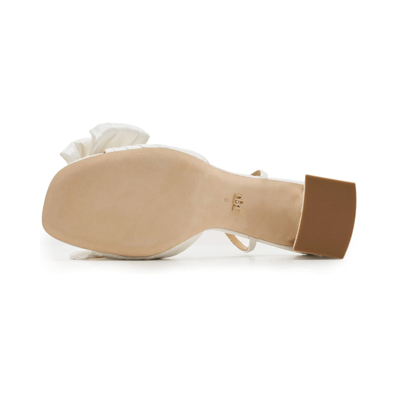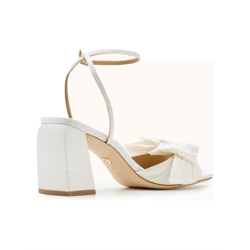 - The Badgley Mischka Olani is a sophisticated statement piece that blends elegance with comfort. Designed with a buckle adjustable ankle strap, it features an open square toe and a striking oversized bow that adds glamor to any outfit. The flared block heel offers stability and ease.