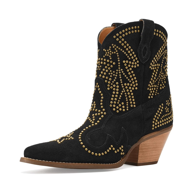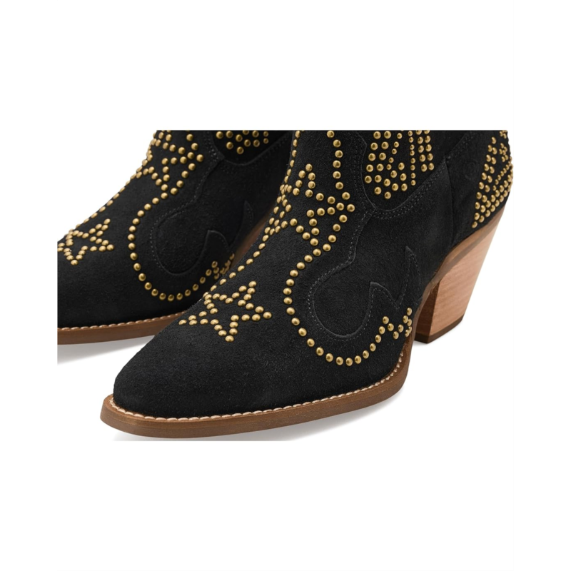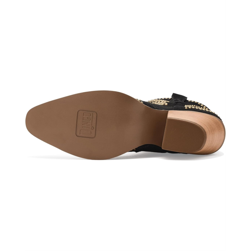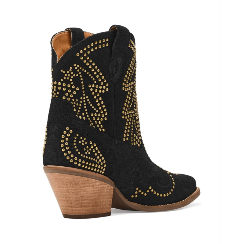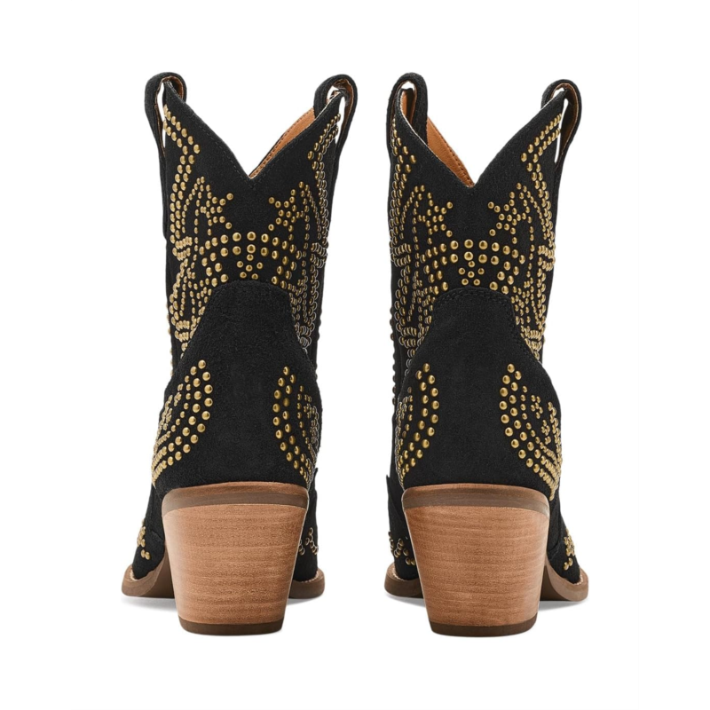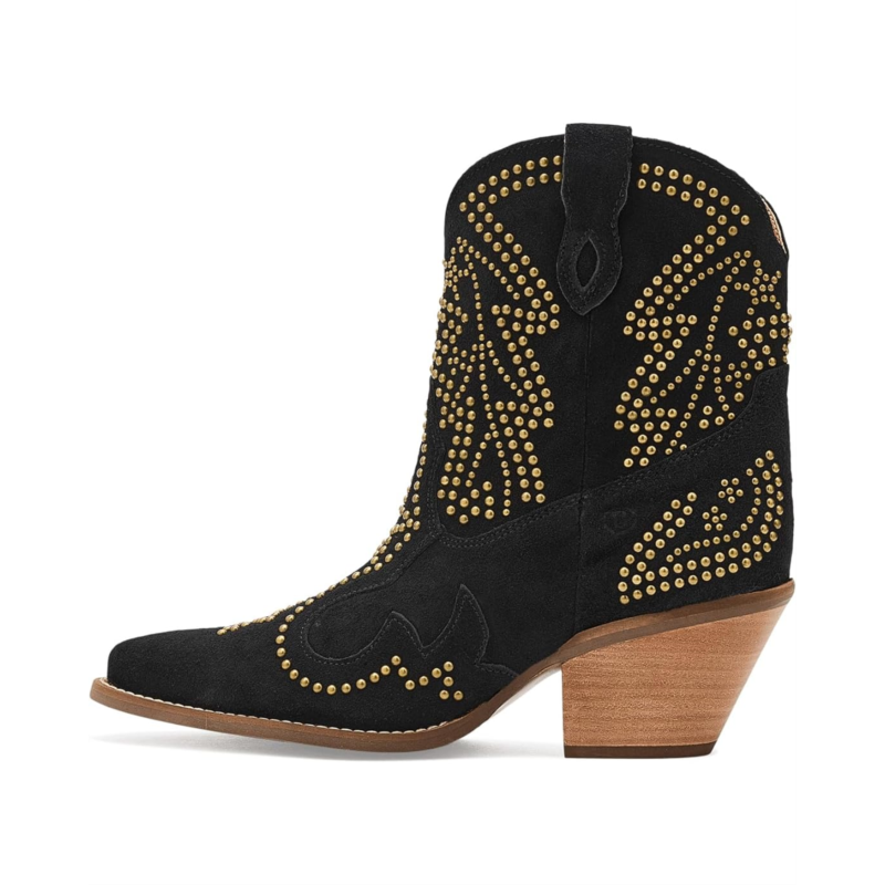 - Light up the night in the Dingo Seein'' Stars booties, where bold studs create a celestial pattern that sparkles with every step. This sleek, edgy silhouette blends cosmic inspiration with rockstar attitude, making it perfect for those who want to shine bright and stand out. These calf-high boots are made of a cushion comfort foam insole and polyester lining. Their suede upper features side pull handles for easy on and off. With a perfect mix of glam and grit, these heeled boots are made for nights full of unforgettable moments.