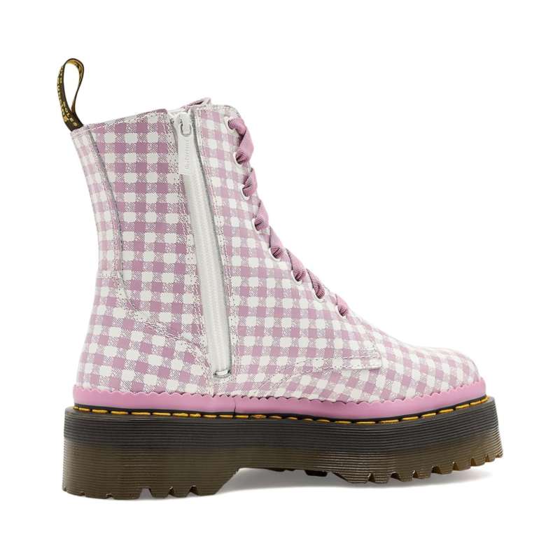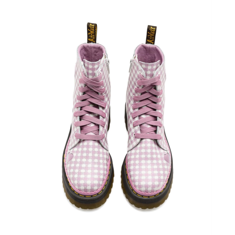 - Look effortlessly edgy wearing the Dr. Martens Jadon Heart, Easy to style and impossible to ignore, these cut boots bring a confident, trend-driven touch to any outfit. Crafted from smooth leather upper, textile lining, and leather insole, this pair of boots features round toe, satin padded heart detailing allover, lace up front closure with additional side zippered closure, and Classic Docs DNA including visible yellow stitching, grooved sides, and a scripted heel-loop.
