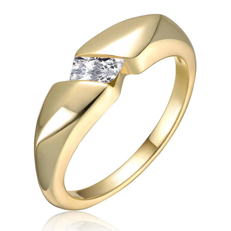 14K Gold Plated with Clear Cubic Zirconia Modern Statement Ring. This beautiful 14K gold-plated ring is sleek and sculptural, showcasing a single clear cubic zirconia in an eye-catching, odd rectangular shape. The asymmetrical band curves fluidly around the stone, creating a modern silhouette that feels both bold and refined-a statement piece with minimalist edge-perfect for everyday elegance or standout styling. Available in sizes 6, 7, and 8.
