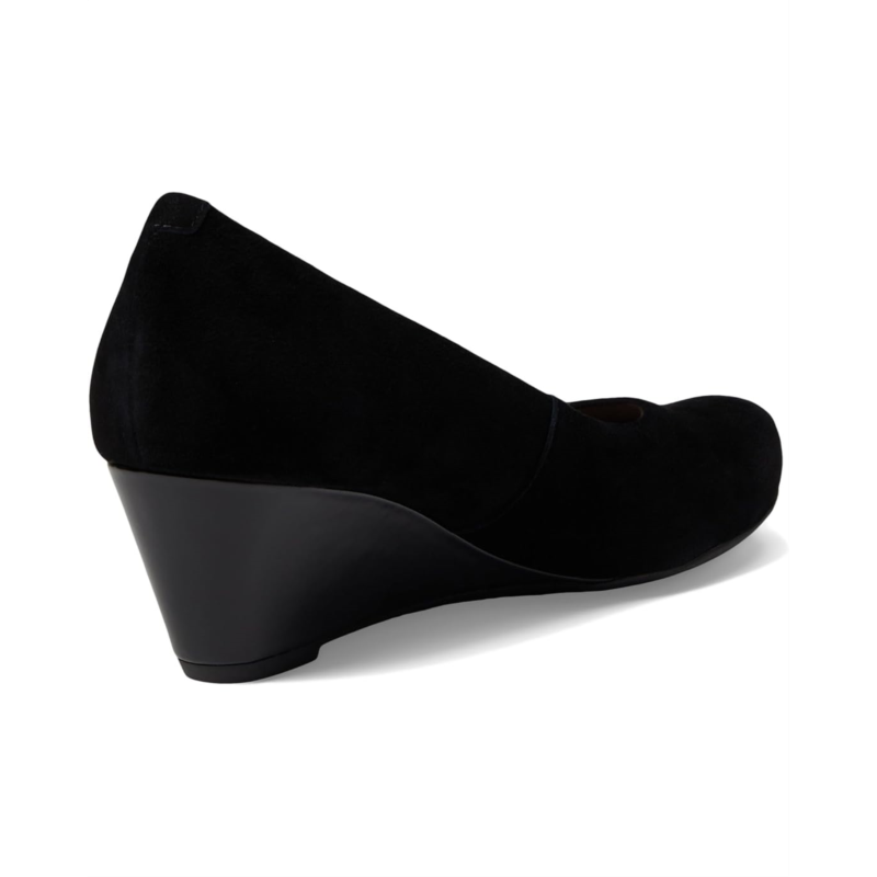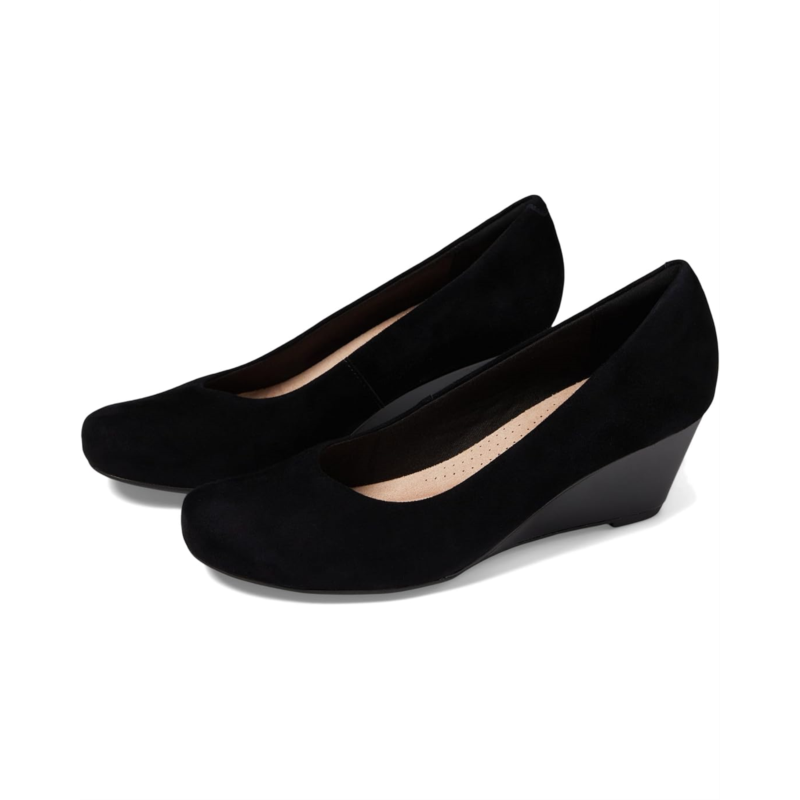 Step up in style and comfort by wearing the Clarks Flores Tulip heels. The slip-on low-top style heels have a closed round-toe design with statement wedges for an effortless look. The suede upper with synthetic lining and faux leather insole makes them comfortable to wear all-day long.