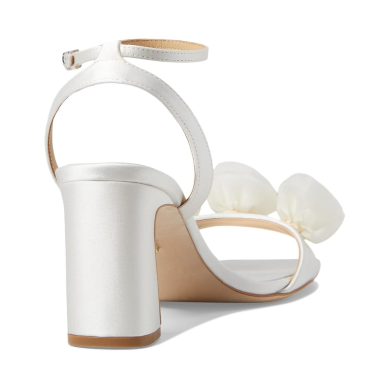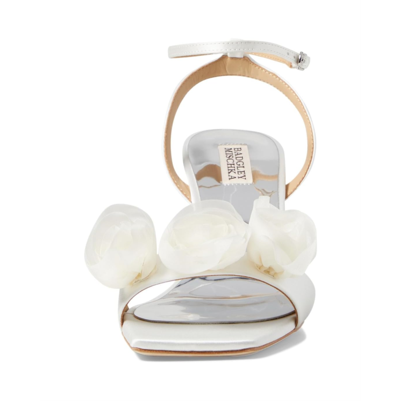 Elevate your style with Badgley Mischka Carli sandals. Adorned with a delicate rosette detail, they exude romantic charm. Featuring an open square toe and high block heel, they offer modern sophistication with a touch of elegance.