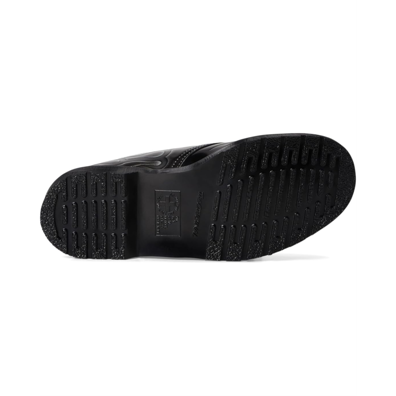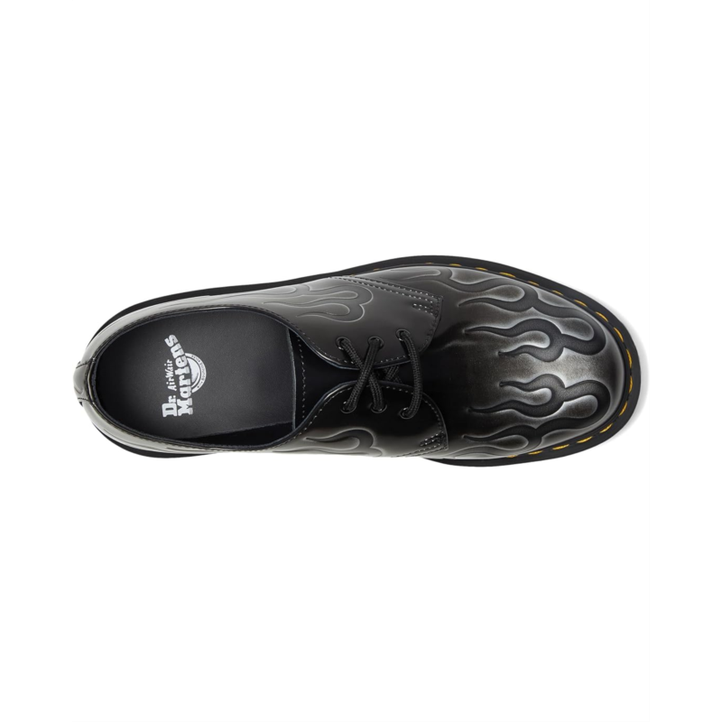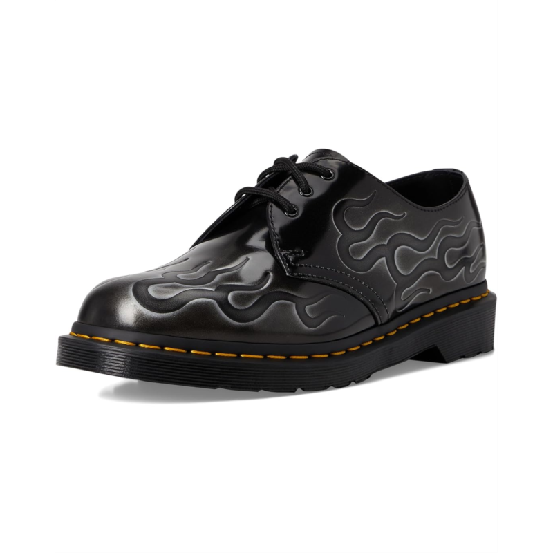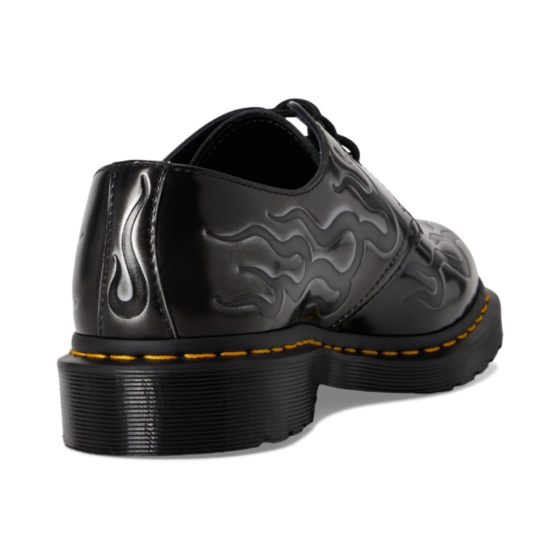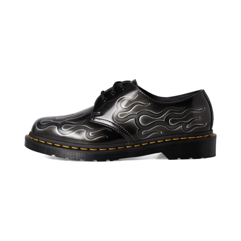 The classic Dr. Martens 461 Inferno shoe is constructed from Arcadia, a high-shine archival leather that exposes more of the base silvertone through wear, featuring embossed flames. The low-top style features a sleek leather upper, breathable leather lining, and EVA insole.