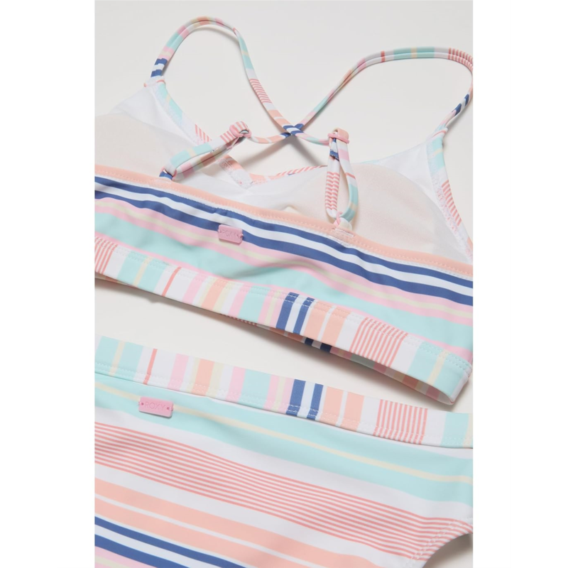 The Roxy Kids Cabana Bay Bikini Set features a bikini with adjustable straps and high-waist bottoms. Made from premium buttery soft fabric, this bikini set is styled with an allover striped pattern. The UPF 50+ protection shields your skin against harmful sun rays. Offering a perfect blend of comfort and style, this printed bikini set is perfect for your kid''s beach trips and swim adventures.