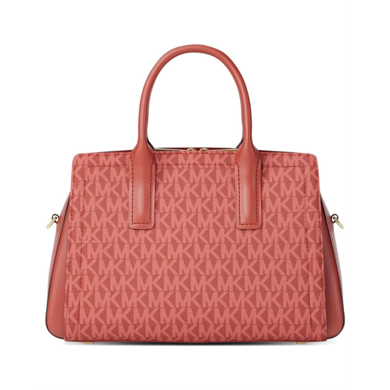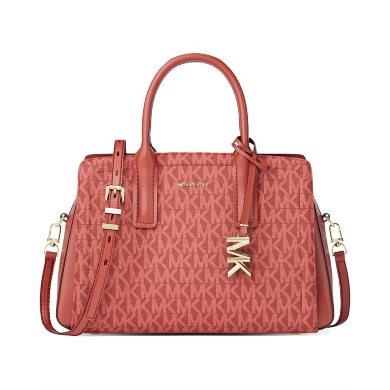 The MICHAEL Michael Kors Laila Small Satchel is made of durable polyvinyl chloride material, making it a stylish and practical choice for everyday use. It features dual shoulder straps for easy carrying, as well as a removable and adjustable crossbody strap for versatile wear. The interior compartment comes with a zippered closure to keep your belongings secure, while the two compartments with magnetic fastening provide easy access to your essentials.