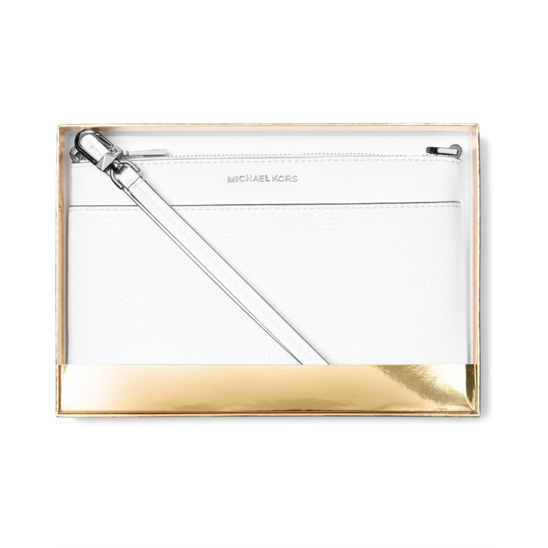 Get ready to take on the day in style carrying the MICHAEL Michael Kors Jet Set Medium Top Zip Convertible Wristlet. Crafted from beautifully textured pebbled leather with sleek, smooth leather trim, this wristlet is the perfect blend of fashion and function. The zippered top closure keeps your belongings secure, and the detachable wrist strap allows for seamless transitioning from day to night.