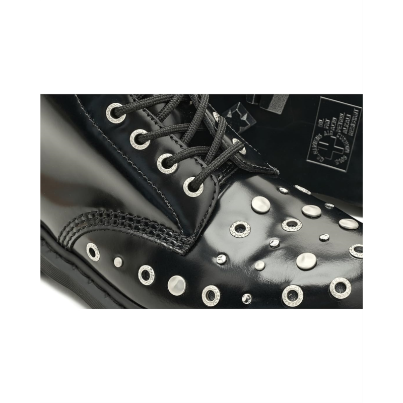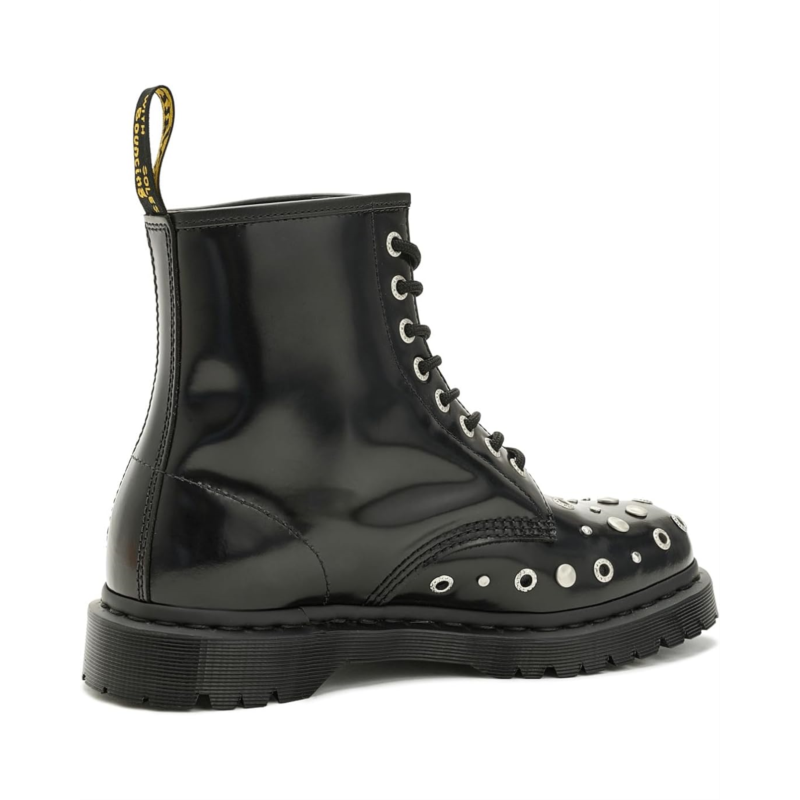 - Styled with an angular shape and a high-shine finish, the Dr. Martens 1460 Hardware boots add a bold, futuristic look to your outfits. The mid-top leather upper of these boots features a traditional 8-eyelet lace-up closure that offers a perfect fit. These work boots are designed with Goodyear welt stitching which makes them a durable choice. The EVA foam footbed provides all-day comfort. Make your fashion statement wearing these leather boots.