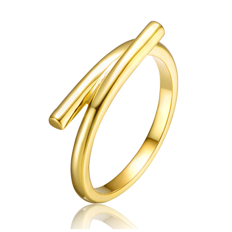 Elegant 14K Gold Plated Bypass Ring. This beautiful ring features interesting design made out of one larger piece of solid metal elegantly curved to form the band, pieces that are connected in the center and extended to form bypass alike design. Crafted with 14K Gold Plated and it is available in sizes 6, 7 or 8. Its a unique piece of jewelry for all combinations. occasion.